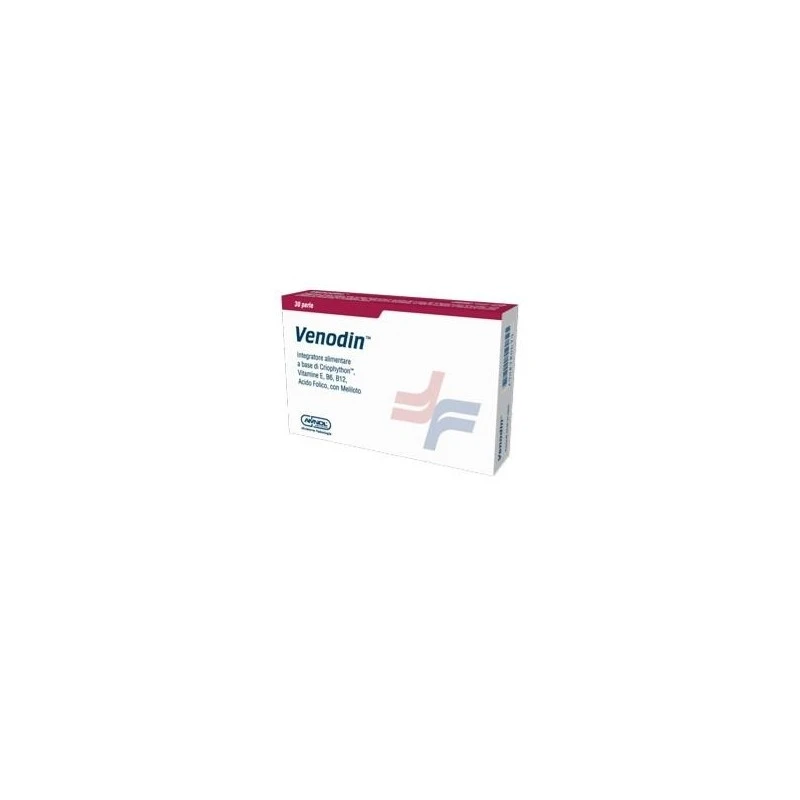 VENODIN Descrizione Integratore alimentare che, grazie all’estratto di Meliloto, è utile per la corretta funzionalità del microcircolo. Le Vitamine B6, B12 e l’Acido Folico favoriscono il controllo dei livelli di omocisteina nel sangue. Senza glutine. Ingredienti per 1 perla%VNR Diosmina225 mg Esperidina25 mg Vitamina E (D-alfa-tocoferolo)12 mg100 Vitamina B6 (Piridossina cloridrato)1,4 mg100 Vitamina B12 (Cianocobalamina)2,5 µg100 Folato (Acido Folico)200 µg100 Meliloto (Melilotus officinalis (L.) Pallas, sommità fiorite) estratto secco titolato 20% in Cumarina (supporto: maltodestrine) di cui Cumarina35 mg 7 mg Altri ingredienti: olio di girasole; gelatina alimentare; agente di resistenza (glicerolo); addensante: mono e digliceridi degli acidi grassi; emulsionante (lecitina di girasole); colorante (E172); coloranti (E171, E120). VNR= Valore Nutritivo di Riferimento. Modalità d’uso Si consiglia l’assunzione di 1 perla al giorno a stomaco pieno. Avvertenze Per donne in gravidanza o in allattamento e bambini si raccomanda di sentire il parere del medico. Gli integratori non vanno intesi come sostituti di una dieta variata, equilibrata e di un sano stile di vita. Non superare la dose giornaliera consigliata. Tenere lontano dalla portata dei bambini al di sotto dei 3 anni. Conservazione Conservare in luogo fresco ed asciutto.Proteggere da luce e calore. Validità a confezionamento integro: 36 mesi. Formato 30 perle in blister. Peso netto: 25 g. Cod. A05020