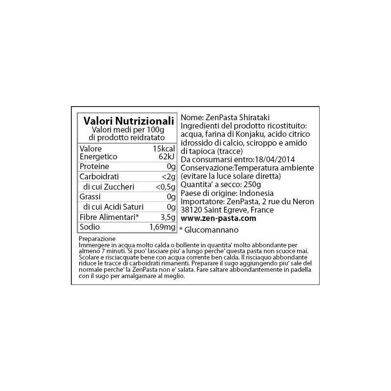 Ingredienti del prodotto reidratato: acqua, farina di konjac, idrossido di calcio, acido citrico, sciroppo e amido di tapioca (tracce).
