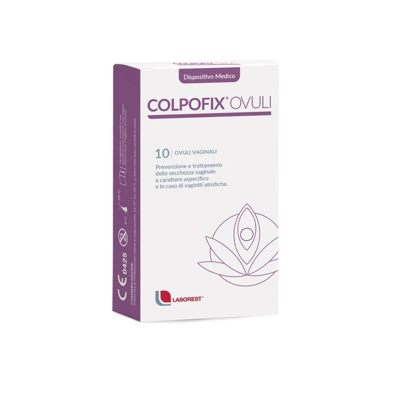Colpofix Ovuli Dispositivo medico che aiuta a mantenere inalterate le difese naturali della vagina ed agevola il ripristino della flora vaginale; la specifica formula a base di acido ialuronico ed acido lattico aiuta ad eliminare i sintomi conseguenti a squilibrio della idratazione e/o del pH vaginale. L’acido ialuronico svolge un’azione idratante e lubrificante contro la secchezza vaginale facilitando il ripristino dell’ambiente vaginale.