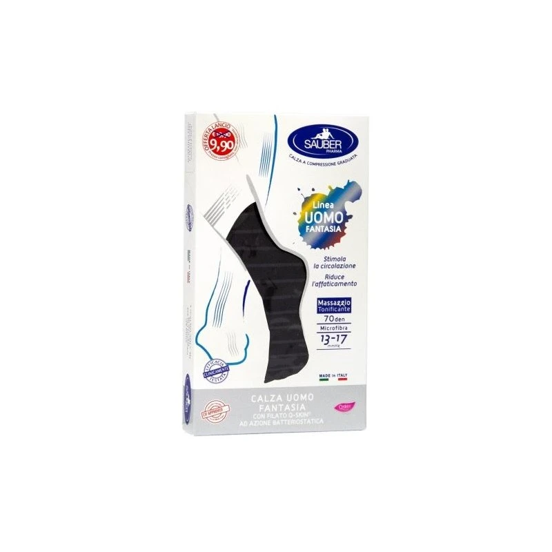Calze uomo fantasia a compressione graduata in filato Q-SKIN, ad azione batteriostatica per facilitare la traspirazione della pelle e ridurre la sudorazione del piede. Possono essere abbinate sia ad un look classico ed elegante, sia ad un abbigliamento casual e giovanile. Ideali per essere indossate in qualunque occasione, dal lavoro al tempo libero, fino all’occasione speciale. Realizzate con polsino morbido che non stringe, e con punta e tallone in tinta unita.