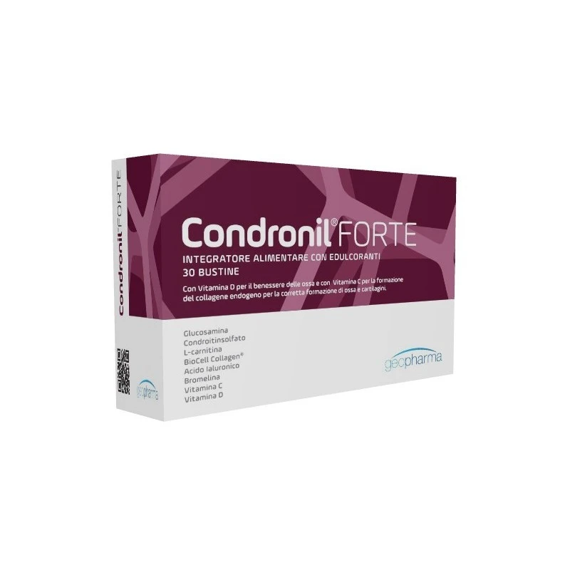 Condronil Forte è un integratore alimentare a base di Glucosamina solfato, L-Carnitina, BioCell Collagen, Acido Ialuronico, Vitamina C, Bromelina e Vitamina D.