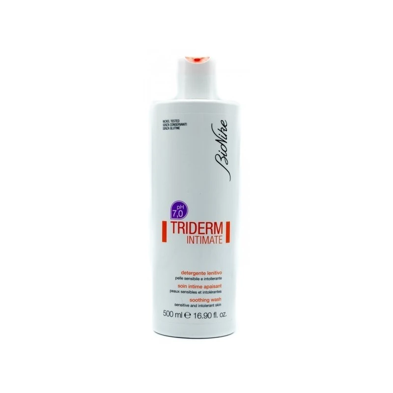 TRIDERM INTIMATE detergente lenitivo Descrizione Detergente intimo idratante e protettivo per teenager e donne, anche in menopausa. Per pelli sensibili e intolleranti. Detergente a pH neutro (7.7), indicato per l’igiene intima delle teenager e delle donne, anche in età matura e in menopausa, quando la carenza ormonale comporta una riduzione delle difese fisiologiche. A base di tensioattivi non aggressivi, è arricchito con sostanze idratanti e lenitive per contrastare la secchezza delle mucose e il fastidioso prurito associato. Svolge un’azione lenitiva per le teenager e un’azione preventiva contro irritazioni e arrossamenti tipici della menopausa. Contiene profumo esente da allergeni. Contiene: – alfa-bisabololo: componente dell’olio essenziale di camomilla, svolge un’azione lenitiva contro irritazioni e arrossamenti; – acqua distillata di fiordaliso: con proprietà lenitive e disarrossanti, è impiegata come addolcente e decongestionante; – acqua distillata di mirto: ha proprietà lenitive, oltre che calmante degli arrossamenti; – agente deodorante/anti-odore: contrasta i batteri responsabili del cattivo odore e svolge una piacevole azione deodorante. Senza conservanti. Nickel tested. Modalità d’uso Diluire 1 o 2 dosi in acqua o direttamente sul palmo della mano, detergere e sciacquare accuratamente. Componenti Aqua (water), sodium myreth sulfate, disodium cocoamphodiacetate, PEG-200 hydrogenated glyceryl palmate, glycerin, myrtus communis leaf water, dimethyl phenylbutanol, hydrolyzed rice bran protein, PEG-7 glyceryl cocoate, coco-glucoside, caprylyl glycol, glycol distearate, allantoin, bisabolol, centaurea cyanus flower water, pentylene glycol, polyquaternium-10, sodium lauroyl glutamate, ethylhexylglycerin, lactic acid, trisodium ethylenediamine disuccinate, parfum (fragrance). Conservazione Conservare a temperatura ambiente. Validità a confezione integra: 36 mesi. Formato Flacone da 500 ml. Cod. 212153