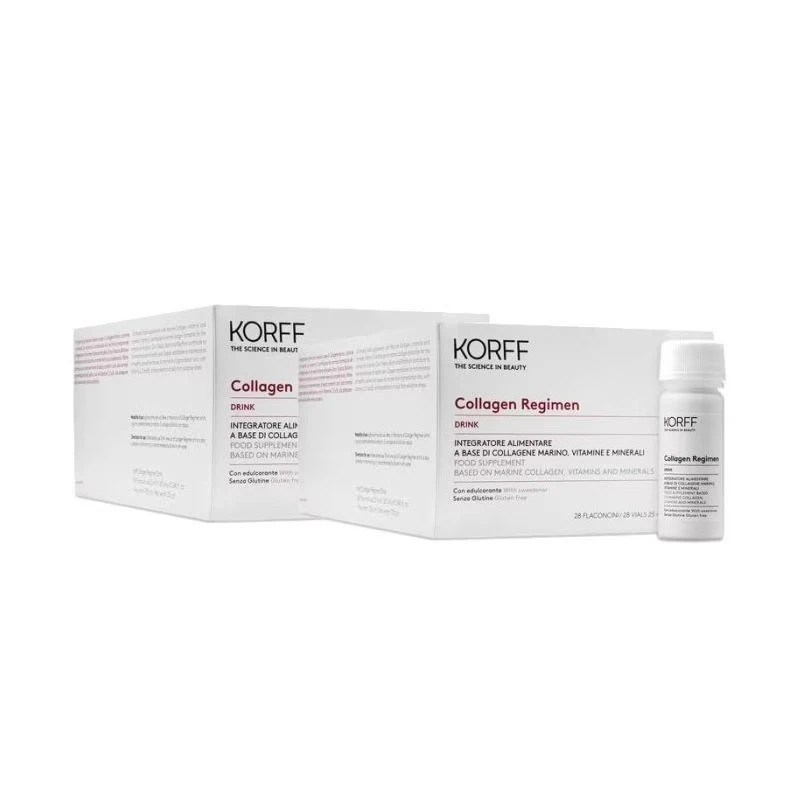 korff Collagen Drink 28 Giorni è un Integratore alimentare bevibile a base di Collagene Marino, vitamine e minerali. La vitamina C contribuisce alla normale formazione del collagene per la normale funzione della pelle. Zinco, Niacina, Biotina e Riblofavina contribuiscono al mantenimento di una pelle sana; il Rame contribuisce al mantenimento di tessuti connettivi sani, alla normale pigmentazione della pelle e, con le Vitamine C, E e B2, alla protezione delle cellule dallo stress ossidativo.