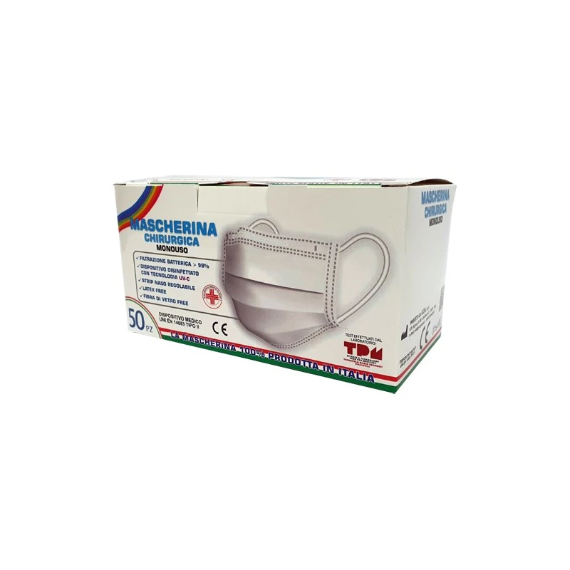Mascherina chirurgica monouso a tre strati, in tessuto non tessuto TNT in polipropilene opaco, inodore, con filtro ad elevata efficienza, morbida, priva di fibra di vetro, ipoallergenico, buona permeabilità all’aria. Si fissa con elastici privi di lattice. Rifiniture termosaldate. Disponibile nei colori: bianco, verde e azzurro.