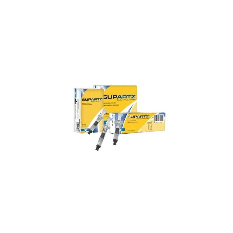 Soluzione sterile, non pirogena di ialuronato di sodio, altamente purificata, priva di azione flogistica, con elevato peso molecolare che viene estratta dalle creste di gallo ed è un polisaccaride contenente unità disaccaridiche ripetute di acido D-glucuronico e N-acetil-D-glucosammina. Lo ialuronato di sodio è un componente comune di tutte le matrici extracellulari dei tessuti connettivi. Si trova in molte specie differenti, incluso l’uomo, ma è identico, dal punto di vista chimico, indipendentemente dalla specie di origine. Lo ialuronato di sodio utilizzato nella fabbricazione di Supartz è di origine aviaria e viene derivato, per mezzo di un processo di purificazione prolungato. Supartz è una soluzione trasparente ed inodore, con pH da 6,8 a 7,8 e un rapporto di 1,0-1,2 tra pressione osmotica e soluzione salina. Dopo l’iniezione nell’articolazione, una piccola quantità di Supartz viene metabolizzata nel fluido sinoviale, mentre il resto si distribuisce nei tessuti sinoviali dove viene parzialmente degradato in molecole più piccole. Successivamente Supartz entra nel circolo ematico ed è metabolizzato principalmente nel fegato. I prodotti del metabolismo non sono tossici e vengono eliminati dall’organismo attraverso i polmoni, l’intestino e le vie urinarie. Supartz è commercializzato in soluzione sterile in siringhe monouso preriempite per ridurre il rischio di contaminazioni durante l’aspirazione della soluzione.