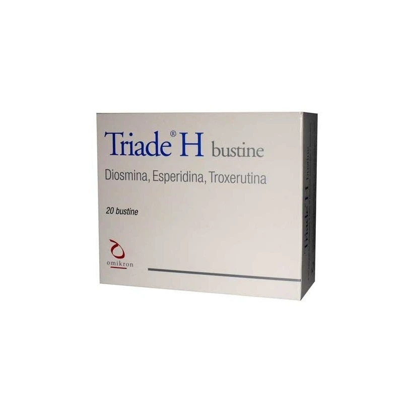 Triade H Triade H è indicato come coadiuvante nella flebopatia ipotonica costituzionale, nell’insufficienza venosa cronica e nelle sue complicanze, in tutte le manifestazioni di fragilità capillare e nella sindrome emorroidaria. Modalità d’uso Assumere una bustina al giorno, sciolta in mezzo bicchier d’acqua, dopo uno dei pasti principali. Avvertenze Non superare la dose giornaliera raccomandata. Tenere fuori dalla portata dei bambini al di sotto dei tre anni di età. Gli integratori non vanno intesi come sostituti di una dieta variata. Non assumere durante la gravidanza e l’allattamento. Componenti Una bustina contiene: destrosio anidro da frumento; maltodestrina da mais; diosmina; troxerutina; esperidina; fruttosio; aroma agrumi; colorante: E162; E101; amido pregelatinizzato; antiagglomerante: biossido di silicio; acidificante: acido citrico; edulcorante: sucralosio. Formato Confezione da 20 buste.