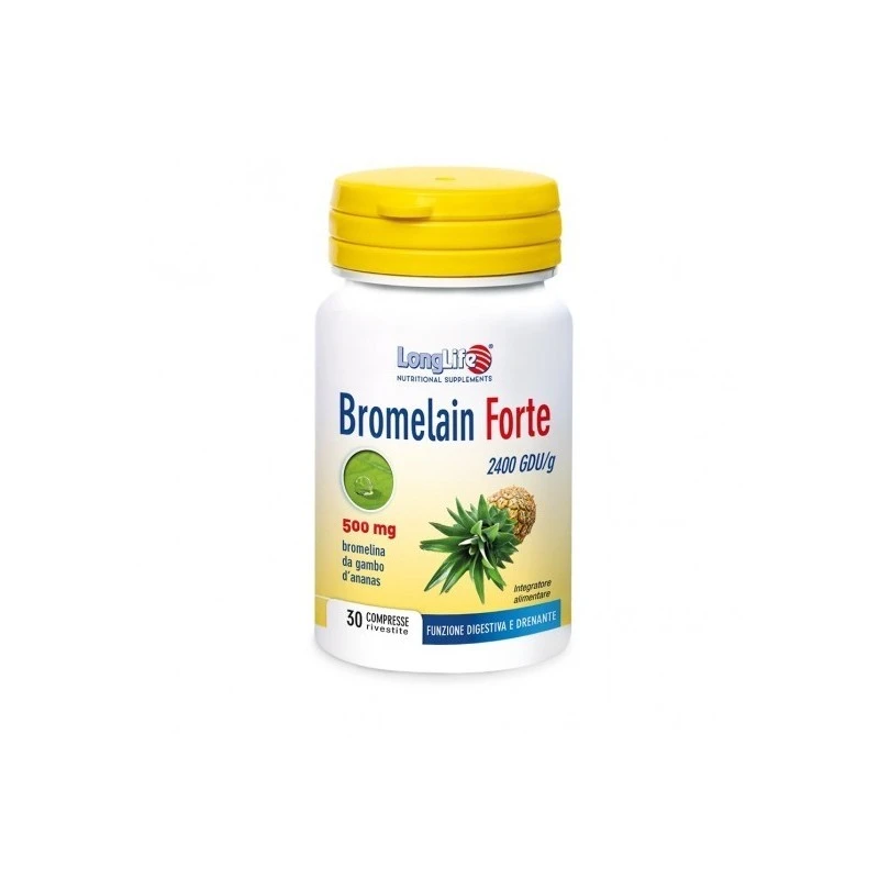 Bromelina (da gambo d’ananas-Ananas comosus L. Merr.); agente di carica: calcio fosfato bibasico, cellulosa m.c.; amido di mais; antiagglomerante: magnesio stearato vegetale; agenti di rivestimento: idrossipropilmetilcellulosa, polietilenglicole; colorante: biossido di titanio.