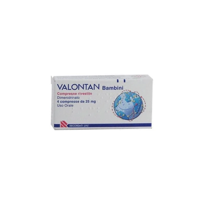 Indicazioni terapeutichePrevenzione e trattamento della nausea, del vomito e della vertigine, proprie delle naupatie (mal di mare, d’auto, di treno, d’aereo).ControindicazioniIpersensibilità al principio attivo o ad uno qualsiasi degli eccipienti. Controindicato nei bambini di età inferiore ai 2 anni. Generalmente controindicato durante la gravidanza e l’allattamento.Principi attivi Compresse rivestite : Ogni compressa rivestita contiene: Principio attivo Dimenidrinato 25 mg Supposte : Ogni supposta contiene: Principio attivo Dimenidrinato 25 mg Per gli eccipienti : vedi 6.1Eccipienti Compresse rivestite : Ogni compressa rivestita contiene: Eccipienti: Saccarosio 15,0 mg, polivinilpirrolidone 2,0 mg, silice precipitata 1,5 mg, magnesio stearato 1,5 mg, amido di mais 45,0 mg, idrossipropilmetilcellulosa 1,875 mg, polietilenglicole 400 0,1875 mg, titanio biossido 0,9375 mg. Supposte : Ogni supposta contiene: Eccipienti: Silice precipitata 10 mg, gliceridi semisintetici 1500 mg.PosologiaNei bambini di età fra 2-6 anni : 1 compressa o 1 supposta di VALONTAN bambini fino ad un massimo di 3 volte al di, secondo le necessità. Nei bambini in età fra 7-12 anni: 1-2 compresse o supposte di VALONTAN bambini 2-3 volte al dì. Si consiglia l’assunzione circa 30 minuti prima di ottenere l’effetto desiderato. Non somministrare a bambini di età inferiore ai 2 anni (vedi 4.3) Nono superare le dosi consigliate. Non usare per trattamenti prolungati.Gravidanza e allattamentoSe ne sconsiglia l’uso durante la gravidanza. Nelle pazienti che allattano occorre decidere se rinunciare a nutrire al seno il bambino e iniziare il trattamento o, viceversa, proseguire l’allattamento evitando la somministrazione del prodotto.ConservazioneNessuna.AvvertenzeL’uso degli antiistaminici contemporaneamente a certi antibiotici o altri farmaci ototossici può mascherare i primi segni di ototossicità, la quale può rivelarsi solo quando il danno è irreversibile. Usare con cautela in soggetti affetti da glaucoma, ipertrofia prostatica, altre sindromi di ritenzione urinaria, ostruzione intestinale, ipertensione arteriosa, malattie cardiovascolari, asma bronchiale, bronchite cronica o enfisema, ipertiroidismo. Il medicinale può esacerbare disordini convulsivi. Va pertanto impiegato con molta cautela nei soggetti affetti da epilessia. Le compresse contengono saccarosio, non sono quindi adatte per i soggetti con intolleranza ereditaria al fruttosio, malassorbimento di glucosio-galattosio o deficit di saccarasi-isomaltasi.interazioniDurante il trattamento, allo scopo di impedire fenomeni additivi di sedazione, si dovrà evitare che al bambino siano somministrati farmaci che agiscono sul Sistema Nervoso Centrale.Effetti indesideratiIl più frequente effetto secondario degli antiistaminici è la sedazione che può manifestarsi come sonnolenza. Con l’impiego degli antiistaminici possono verificarsi secchezza delle fauci, fotosensibilità, disturbi dell’accomodazione, disturbi della minzione, cefalea, anoressia, nausea, reazioni cutanee su base allergica. Meno frequentemente vertigini, astenia, insonnia (specialmente nei bambini), euforia, tremori, ipotensione, tachicardia e, ad alte dosi, specie nei bambini, convulsioni.SovradosaggioLa sonnolenza è il sintomo più usuale di iperdosaggio. Dosi tossiche possono produrre: convulsioni, coma e depressione respiratoria. Nel caso attuare una terapia sintomatica; quando necessario, assistenza respiratoria.Effetti su guida veicoli e su uso macchinariNon pertinente.
