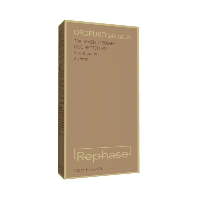 Rephase Oropuro 24k Gold Olio Protettivo Solare. Solare unico e preziosissimo ideato per un’abbronzatura dorata, intensa e protetta in pochissimo tempo. Durante l’esposizione solare stimola e protegge il processo di melanogenesi. Dopo il sole è perfetto per fissare ed esaltare l’abbronzatura. La sera si trasforma nel miglior alleato per un corpo vellutato, scolpito e splendente. Oropuro accoglie l’energia del sole e la riflette.