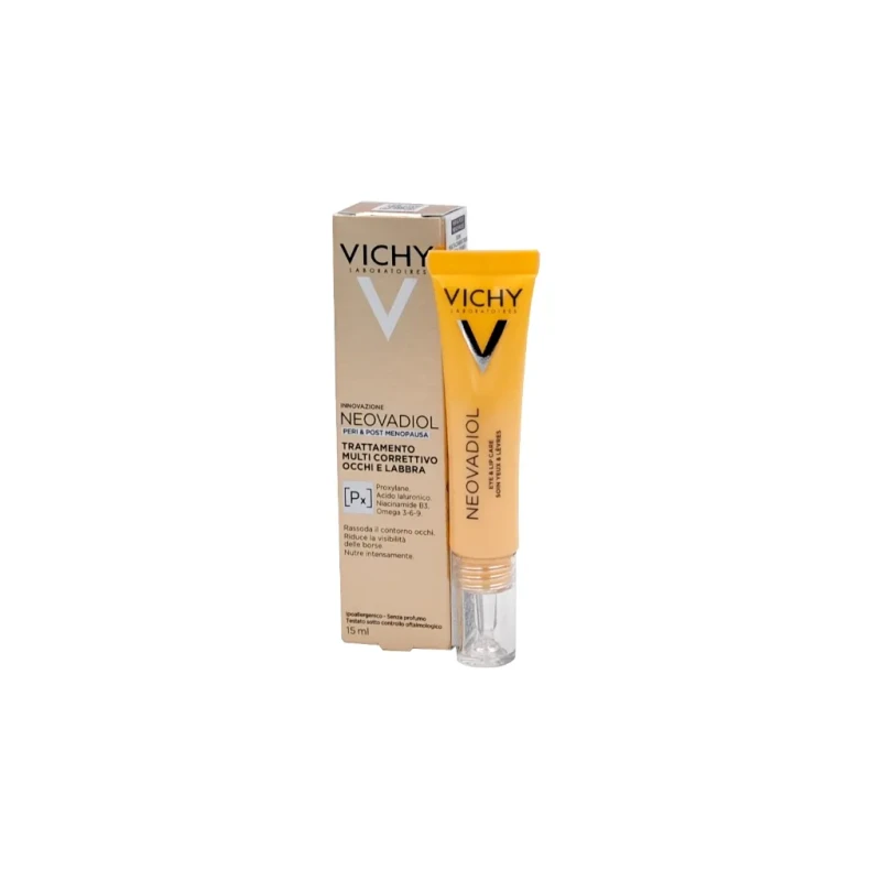 Neovadiol Contorno Occhi & Labbra, formulato con Proxylane, estratto di cassia, acido ialuronico e niacinamide, aiuta a trattare i segni degli effetti della menopausa sulla pelle: la pelle è rassodata, idratata e la sua elasticità è migliorata. Con Neovadiol Contorno Occhi & Labbra, formulato con Omega 3-6-9, acqua vulcanica di Vichy e caffeina la pelle del contorno occhi e labbra è più nutrita e lenita e le borse sotto gli occhi sono ridotte.