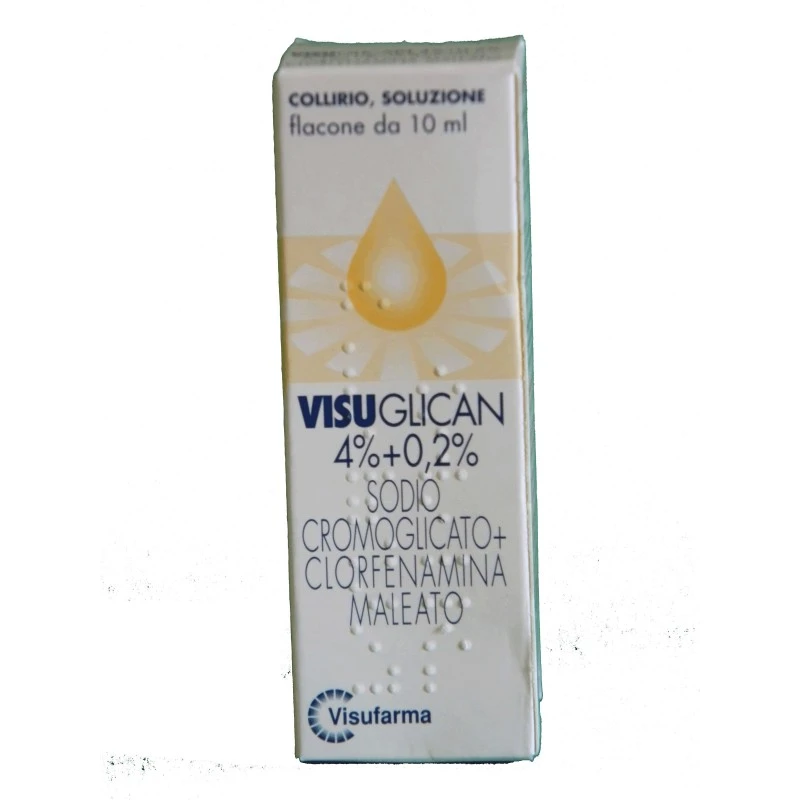 Indicazioni terapeuticheTrattamento delle congiuntiviti di natura tossica, allergiche e primaverili, ad andamento subacuto e cronico.ControindicazioniIpersensibilità ai principi attivi o ad uno qualsiasi degli eccipienti elencati al paragrafo 6.1.Principi attivi100 ml di collirio, soluzione contengono: Principi attivi: Sodio Cromoglicato 4 g; Clorfenamina maleato 0,2 g. Per l’elenco completo degli eccipienti, vedere paragrafo 6.1EccipientiVisuglican Collirio, soluzione in flacone da 10 ml: 100 ml di collirio contengono: Sodio edetato; Fosfato bisodico; Fosfato monosodico; Acqua depurata. Visuglican Collirio, soluzione in contenitori monodose: 100 ml di collirio contengono: Sodio edetato; Fosfato bisodico; Fosfato monosodico; Acqua per preparazioni iniettabili.Posologia1-2 gocce nel fornice congiuntivale quattro volte al giorno. Prima dell’uso assicurarsi che il contenitore monodose sia intatto. Visuglican in Contenitore monodose va usato solo immediatamente dopo l’apertura. L’eventuale residuo non deve essere utilizzato. Evitare che l’estremità del contenitore venga a contatto con l’occhio o con qualsiasi altra superficie.Gravidanza e allattamentoCome per ogni farmaco è opportuno, quando possibile, evitare la somministrazione durante il primo trimestre di gravidanza. Se l’uso di questo prodotto è ritenuto essenziale in una madre che allatta, la paziente deve sospendere l’allattamento.ConservazioneFlacone: Conservare a temperatura non superiore ai 25°C. Monodose: tenere il prodotto lontano da fonti di calore.AvvertenzeDa usare sotto il diretto controllo del medico. Non utilizzare se la soluzione non è limpida. Visuglican flacone da 10 ml contiene fosfato bisodico 6,50 mg per 1 ml equivalente a 65 mg/10 ml, e fosfato monosodico 2 mg per 1 ml equivalente a 20 mg/10 ml. Visuglican monodose contiene fosfato bisodico 8,12 mg per 1 ml equivalente a 4,06 mg/0,5 ml e fosfato monosodico 4,5 mg per 1 ml equivalente a 2,25 mg/0,5 ml.interazioniNon sono note interazioni con altri farmaci. Tuttavia sono possibili effetti additivi quando il Visuglican è somministrato contemporaneamente a H2 antagonisti (cimetidina) e con corticosteroidi.Effetti indesideratiRaramente sono stati riportati fenomeni irritativi e bruciore. In questi casi è consigliabile sospendere il trattamento. (vedere paragrafo 4.3) Molto raramente sono stati riportati casi di calcificazione della cornea associati all’uso di colliri contenenti fosfati in pazienti con cornea significativamente danneggiata. Segnalazione delle reazioni avverse sospette. La segnalazione delle reazioni avverse sospette che si verificano dopo l’autorizzazione del medicinale è importante, in quanto permette un monitoraggio continuo del rapporto beneficio/rischio del medicinale. Agli operatori sanitari è richiesto di segnalare qualsiasi reazione avversa sospetta tramite il sistema nazionale di segnalazione all’indirizzo: https://www.aifa.gov.it/web/guest/content/segnalazioni-reazioni-avverse.SovradosaggioNon sono stati riportati fenomeni di sovradosaggio.Effetti su guida veicoli e su uso macchinariIl Visuglican non interferisce sulla capacità di guidare e sull’uso di macchinari.