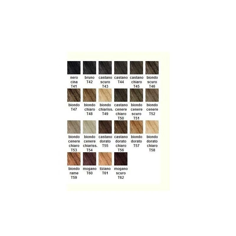 Disponibile nelle tonalità: nero cina, bruno, castano scuro, castano, castano chiaro, biondo scuro, biondo, biondo chiaro, biondo chiarissimo, castano, cenere chiaro, biondo cenere scuro, biondo cenere, biondo cenere chiaro, biondo cenere chiarissimo, castano dorato, castano dorato chiaro, biondo dorato, biondo dorato chiaro, biondo rame.